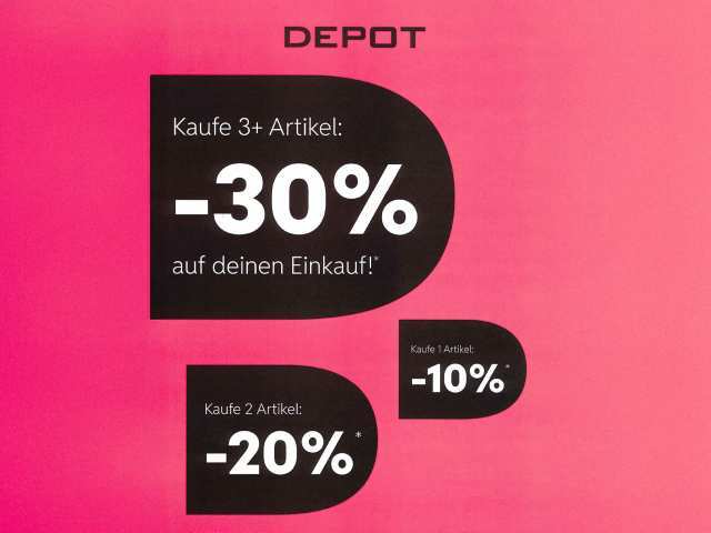 *Gültig bis 01.03.2026 in allen teilnehmenden DEPOT Filialen. Ausgenommen Dehner, REWE, Edeka, Toom. Vom Rabatt ausgenommen sind Möbel, Gutscheine, Geschirr, Bücher, Kooperationsartikel sowie bereits reduzierte Artikel. Nicht mit anderen Aktionen/Coupons/Rabatten kombinierbar. Weitere Aktionsbedingungen finden Sie auf der Website von DEPOT.